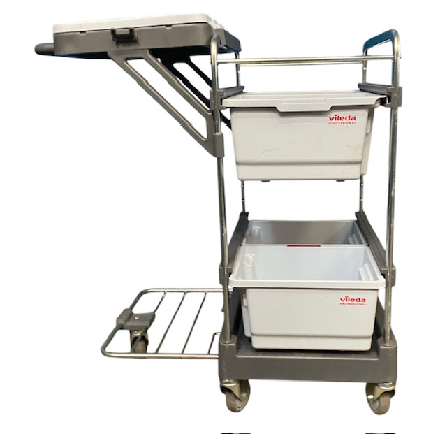 Verrijdbare schoonmaakwagen met houder voor 120 liter afvalzakken en diverse bakken voor doekjes en schoonmaakmiddelen etc.