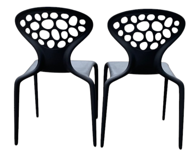 Set van twee kunststof designstoelen.