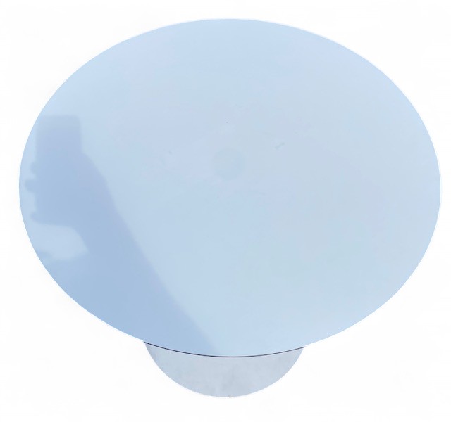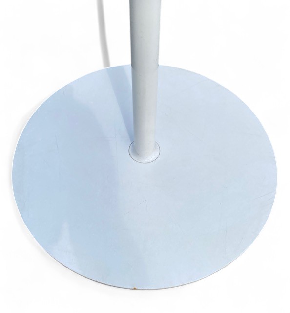 Compacte bijzettafel met zware metalen kolompoot en een wit volkern blad.